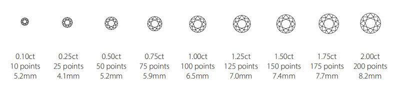 100 points equals 1 carat (1.00ct). A diamond weighing one quarter of a carat, can also be referred to as 25 points or 0.25ct.