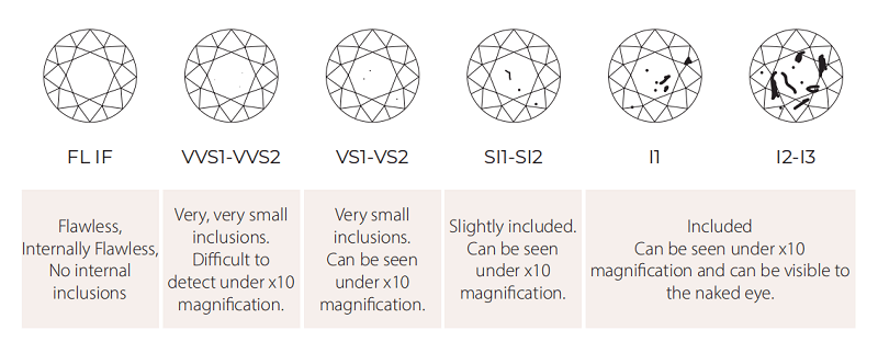 The clarity of a diamond, relates to the amount of inclusions found within the diamond. Inclusions are non-crystallised carbon marks found within a diamond when the the diamond was formed 3 billion years ago.