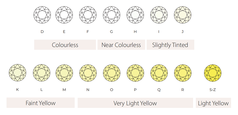 A diamonds colour is determined on a scale from 'D' (colourless) to 'Z' (yellow/ brown). Most diamonds used in jewellery are nearly colourless with pale tints of yellow or brown.